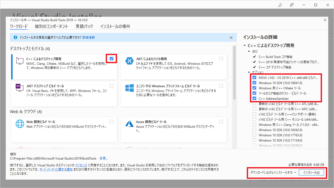上記の項目にチェックが付いていることを確認したら,右下のメニューで「ダウンロードしながらインストールする」を選択して [インストール] をクリックします.
