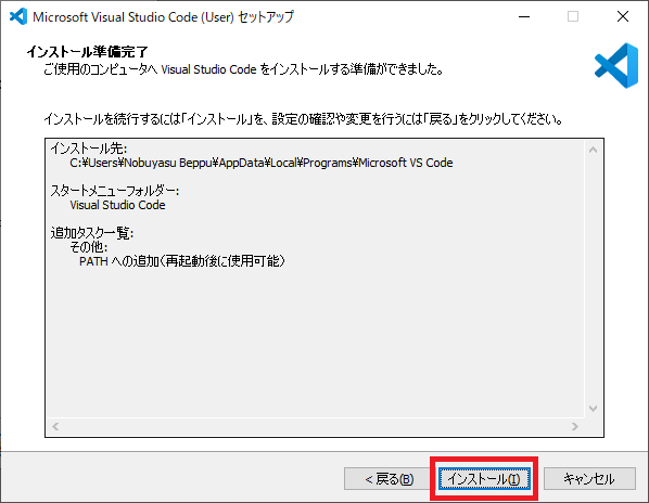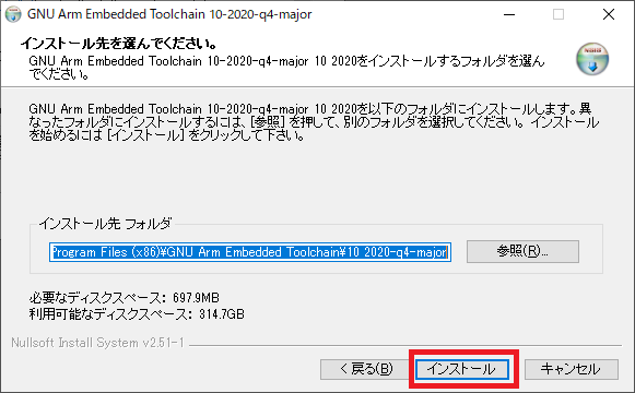 図9の画面ではインストール先のディレクトリ(フォルダ)を選択して [インストール] をクリックします.ここではデフォルトの設定としました.