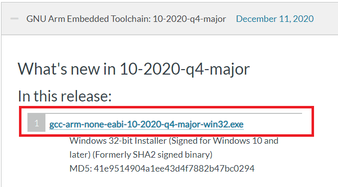 画面を下にスクロールしていくと図4のように最新版の一覧があるので,この中から実行形式のインストーラ(拡張子が“.exe”)である“gcc-arm-none-eabi-10-2020-q4-major-win32.exe”をダウンロードします.インストーラはデスクトップなどのわかりやすい場所に保存することをおすすめします.
