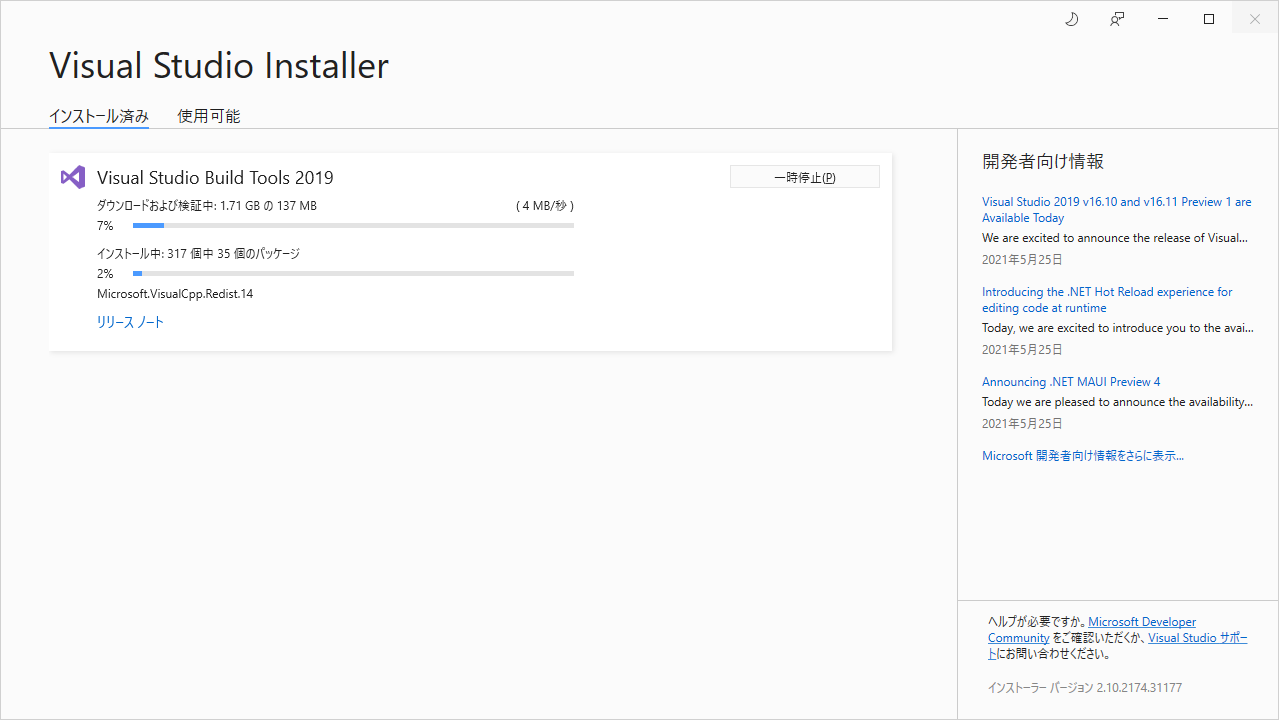 先にインストールした“ARM GCC Compiler”は,C言語で書かれたソース・ファイルからバイナリ・ファイル(オブジェクト・ファイル)を生成するためのツール(コンパイラ)です.実際にラズパイPico上で実行するプログラムを作るためには,このバイナリ・ファイル以外にも複数のライブラリや他のソース・コード由来のバイナリ・ファイルを組み合わせて1つにまとめる工程が必要となります.一般に,複数のC言語のソース・ファイルやライブラリをもとにして実行ファイルを作成する全ての工程のことを「ビルド」(build)といいます.ここでインストールする“Build Tools for Visual Studio 2019”は,この「ビルド」を担うツールです.なお,「コンパイル」は「ビルド」の一部であると言えます.