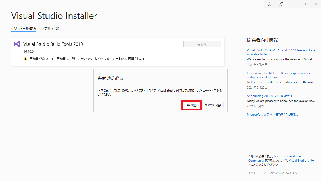 インストールが完了すると図29の画面が表示され,再起動するように求められます.[再開] ボタンをクリックすると再起動します(他に開いているアプリケーションがあれば先に閉じておくことをおすすめします).