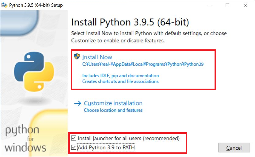 | 図32 ダウンロードしたインストーラをダブル・クリックして起動する | 図33 Install launcher for all users”および“Add Python 3.9 to PATH”にチェックを付けて [Install Now] をクリックする |