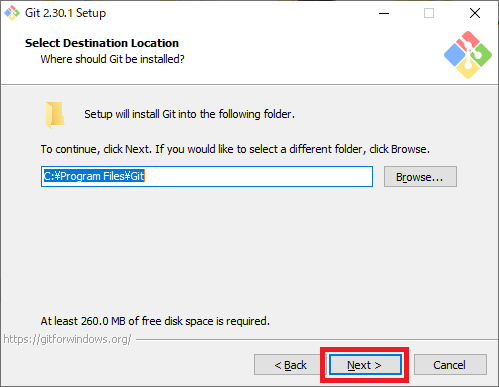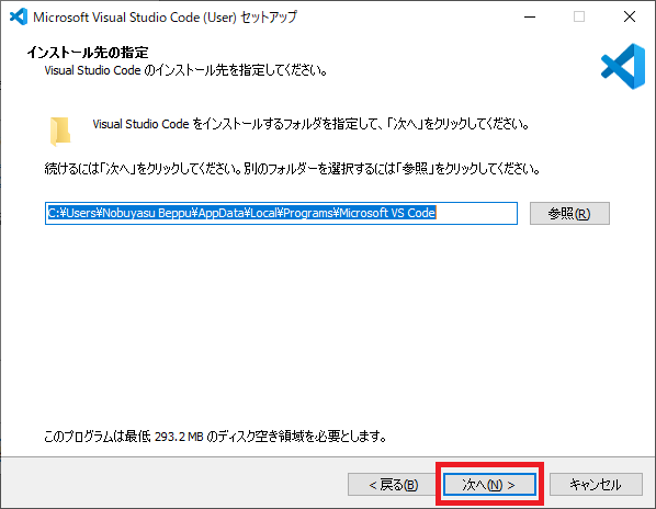 図39の画面ではインストール先のディレクトリを指定します.今回はデフォルトの設定で [Next] をクリックします.