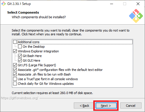 図49の画面では“credential helper”に関する設定を行います.推奨されている“Git Credential Manager Core”を選択して [Next] をクリックします.
