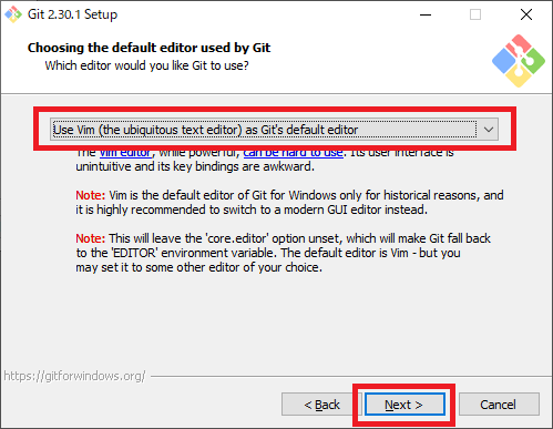 図42の画面ではエディタの設定を行います.今回はデフォルトの“Use Vim as Git’s default editor”のままで [Next] をクリックします.
