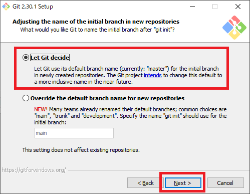 図43の画面では新しいブランチを作成した時の挙動について設定します.ここでもデフォルトの“Let Git decide”を選択して [Next] をクリックします.
