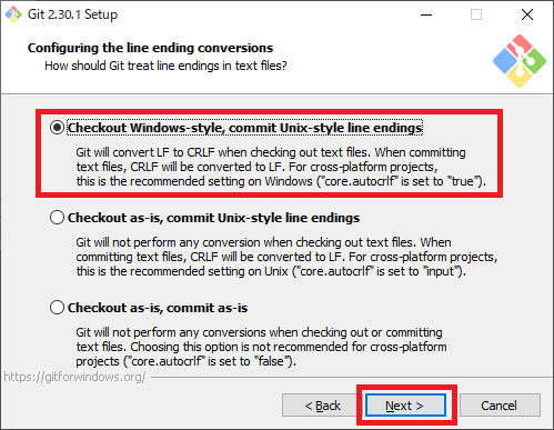 図46の画面では改行コードの設定を行います.今回は“Checkout Windows-style, commit Unix-style line endings”を選択して [Next] をクリックします.