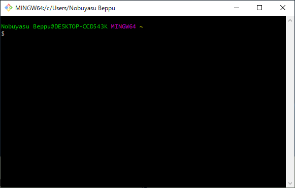 図54のように“Git Bash”の起動画面が表示されれば成功です.このツールはすぐ後に使うので,起動したままにしておきます.なお,再び起動する場合はWindowsスタート・メニューから [G] – [Git] – [Git Bash] をクリックします.