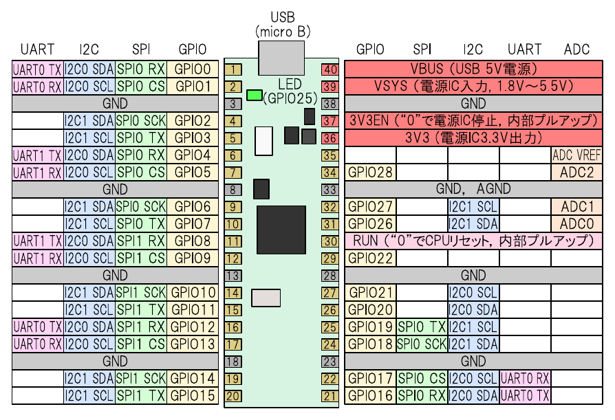 図55にラズパイPicoのピン配置を示します.30番ピンの“RUN”端子の電圧レベルを“0”にすると,マイコンの動作をリセットできます.“RUN”端子はマイコンの内部でプルアップされているので通常は“1”になっていますが,GNDに接続すればリセットすることができます.