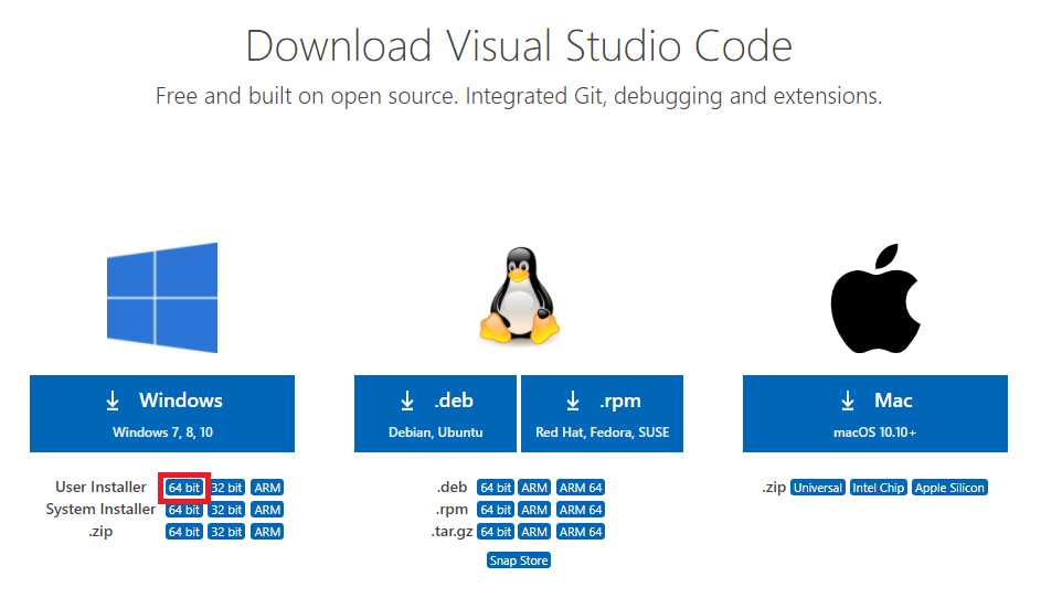 まずは,図57に示す“Download Visual Studio Code”のページにアクセスします.今回はWindowsの“User Installer”の“64bit”版をクリックしてインストーラをダウンロードします.インストーラはデスクトップなどのわかりやすい場所に保存することをおすすめします.