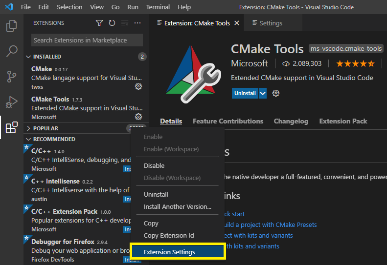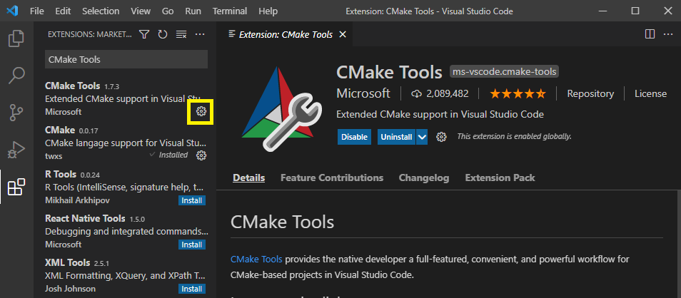 “CMakeTools”がインストールできたら,図69のように“CMake Tools”の項目の「歯車マーク」をクリックします.