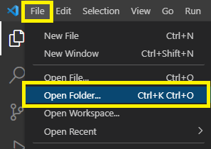 “Developer Command Prompt”上で“code”というコマンドを入力して,“Visual Studio Code”を起動します.メニュー・バーから [File] – [Open Folder…] をクリックして,今回用意した“test”ディレクトリを開きます.