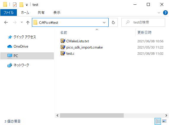 なお,“pico_sdk_import.cmake”および“test.c”は先ほどと同じものを使います.