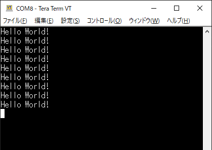 .uf2ファイルを書き込むと,ラズパイPicoは自動的に再起動します.緑色LEDが0.5秒の周期で点滅すれば成功です.また,“TeraTerm”(テラターム)などのターミナル・ソフトを使ってラズパイPicoから送信される文字列を受信すると図83のように表示されます.シリアル・ポートの設定は「スピード:115200」,「データ:8bit」,「パリティ:none」,「ストップビット:1bit」,「フロー制御:none」としてください.