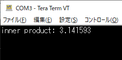 リスト3およびリスト4の内容を追記したプログラムをコンパイルしてマイコンに書き込みます.Tera Termを起動してからマイコンのリセット・スイッチ(黒)を押すと,図16のような結果が表示されます.今回は内積“$(\sin(x), \sin(x)$”に相当する計算を行ったので,さきほど理論計算で確認したとおり“$\pi$”の値が計算結果として得られました.