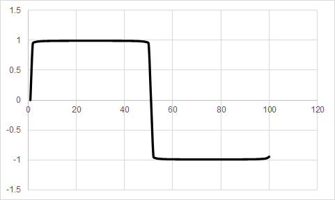図8は“N=100”とした場合,図9は“N=1000”とした場合のグラフです.ここまでくると,ほとんど矩形波であると言ってもよいでしょう.なお,“N=100”の場合のマイコンの計算時間はおよそ2秒ほどです.また,“N=1000”の場合は計算に20秒ほどかかります.自分でリスト1の変数“N”の値をいろいろと変更して,計算結果のグラフの形や計算時間の変化を確かめてみてください.