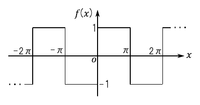ここでは,$\sin$関数だけを使って図3のような「矩形波」(くけいは,square wave)を作ってみます.我々が知っている$\sin$関数のグラフはなめらかな曲線であり,カクカクとした図3の矩形波とはまったく異なる形をしています.ところが,式(2)にもとづいて計算を行うと関数“$f(x)$”として図3の矩形波を得ることができます.