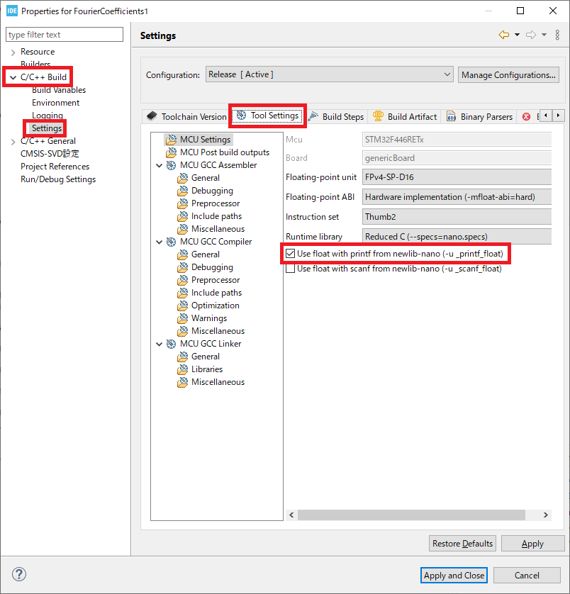まずはメニュー・バーから [Project] – [Properties] をクリックして図6の画面を開きます.“C/C++ Build”の項目を展開して“Settings”をクリックし,“Tool Settings”タブを開きます.ここで“Use float with printf from newlib-nano”にチェックを付けて[Apply and Close]ボタンをクリックします.これでprintf()関数でfloat型の数値を出力できるようになります.