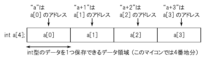ソース・コード上でこの配列の名前“a”を記述すると,これは「配列“a”の先頭のアドレス値」として扱われます.これは,1番目のデータ“a[0]”のアドレスと同義です.また,“a+1”と書いた場合は2番目のデータである“a[1]”のアドレス値を意味します.