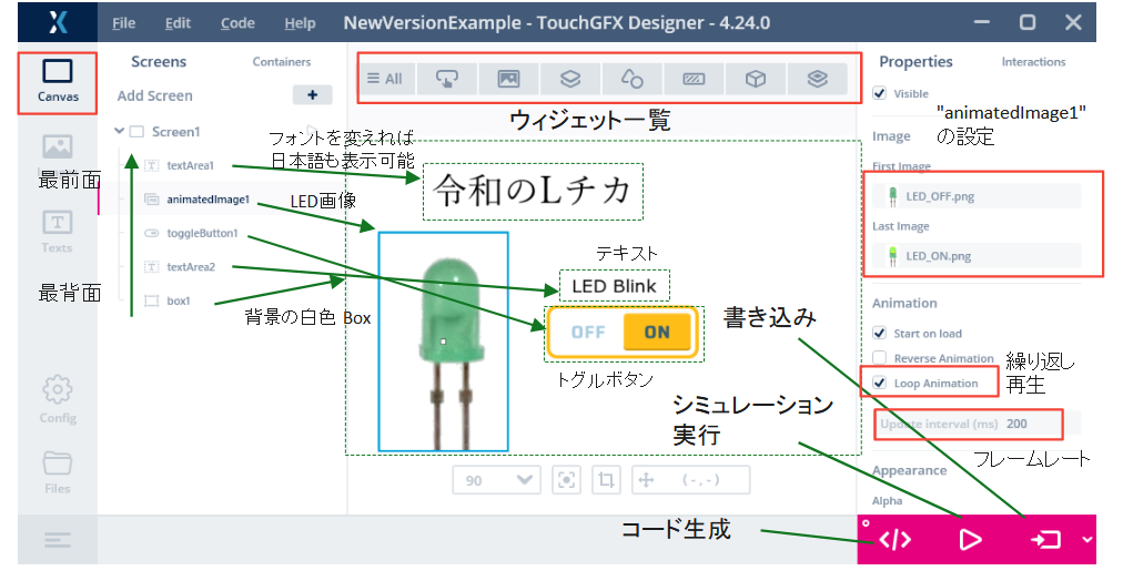 ここでは,点灯状態と消灯状態のLED画像を用意して,画像を一定間隔で切り替えることで,LEDを点滅させるTouchGFX版Lチカを作成します.