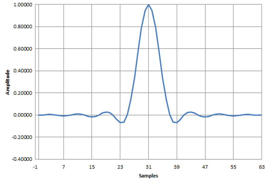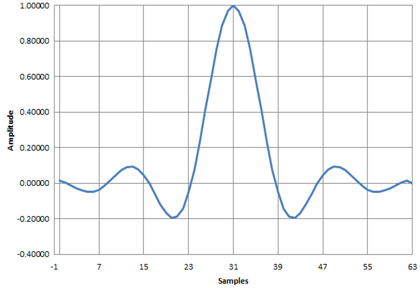 図13に示すのは,フィルタの係数を決める元になるインパルス応答です.図12に,奇数対称の鏡像を追加して,線形位相が保証された長さ63サンプルの係数とします.