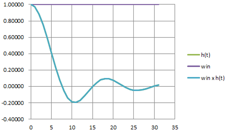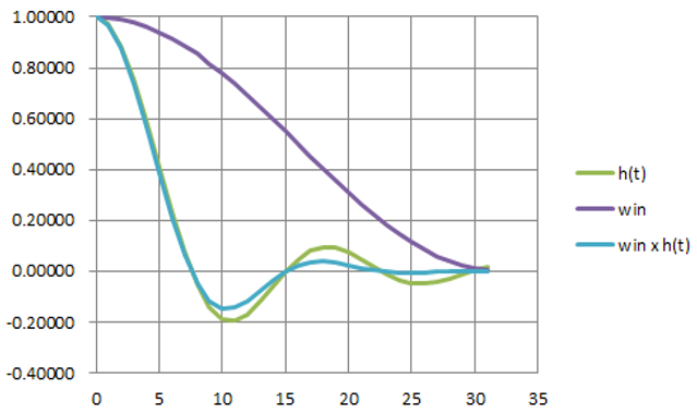 図18は,$beta=0.22$のインパルス応答(緑色)にハン窓(紫色)をかけて得られた応答(水色)です.この応答から,FIRフィルタの係数を求めました(図19).