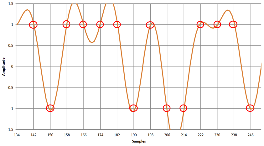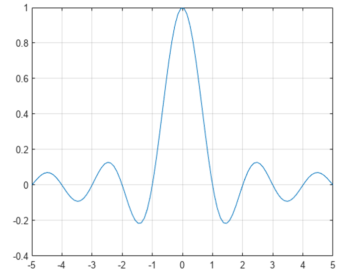 図8 sinc関数のインパルス応答.横軸は時間,縦軸は振幅.一定の時間間隔ごとにゼロクロスしている.これをナイキスト第1基準と言う