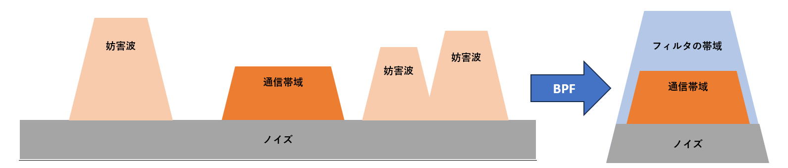 図1に示すように,理想的なフィルタを通過した信号は妨害波が除去され,ノイズ成分も帯域内の最低限の範囲だけに限定されます.