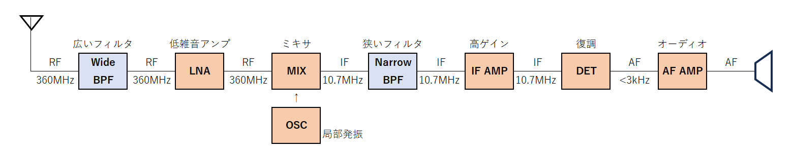 後段の“Narrow BPF”は,ミキサ(MIX)がRF周波数を変換して出力する固定周波数のIF(Intermediate Frequency)信号を通過させます.