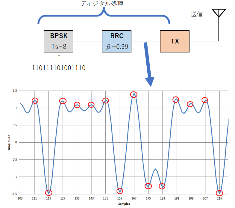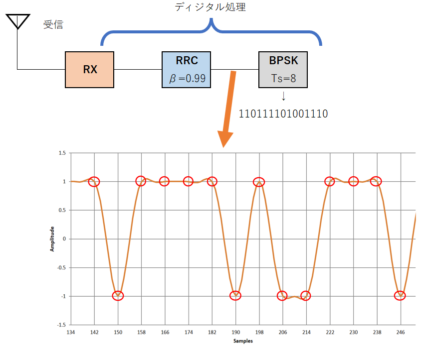 図7に示す受信機のRRCの出力波形(赤色の丸)を見ると,きれいに$+1$と$-1$に収束しています.送受信の両方で帯域制限フィルタをかけていますが,受信出力のシンボルどうしが干渉しません.シンボル間干渉とは,前後のシンボルが影響し合うことを言います.