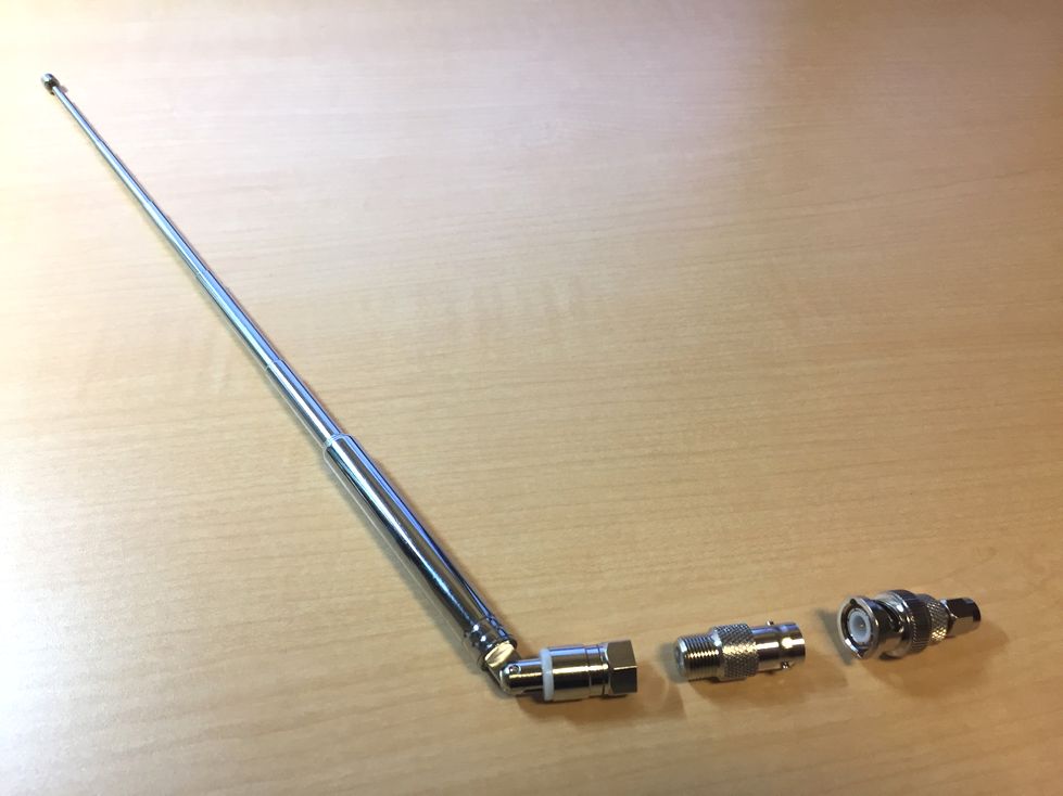FM放送を受信するために,アンテナを接続します.ここでは,手元にあった写真2のような「ロッド・アンテナ」を使いました.なお,このロッド・アンテナにはFコネクタ(オス)が付いていますが,“USRP B205mini-i”のコネクタはSMAコネクタ(メス)です.そこで,写真2のように「F(メス)-BNC(オス)」の変換コネクタと「BNC(メス)-SMA(オス)」の変換コネクタを組み合わせて“USRP B205mini-i”に接続するようにしています.