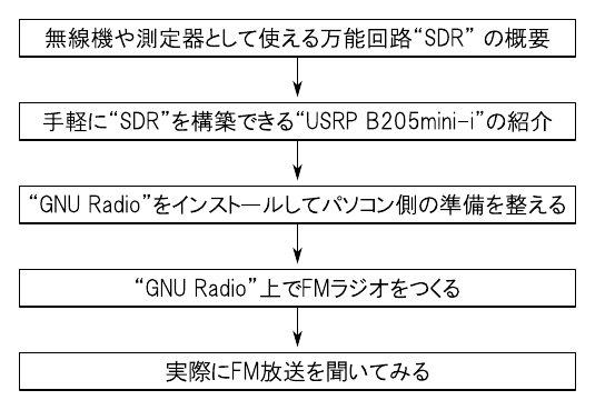 ここから先のおおまかな流れを図1に示します.そもそも“SDR”とは何なのかという話から始めて,実験で使用する“USRP B205mini-i”の構造や機能を簡単に紹介します.続いて,パソコン側の信号処理ソフトウェアである“GNU Radio”のインストール方法や使い方を説明します.最後に,実際にGNU Radio上でFMラジオを構成してFM放送を聞く実験をします.