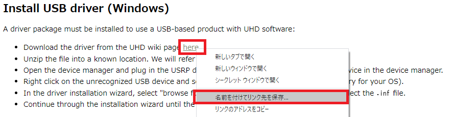 “USRP Hardware Driver and USRP Manual”の“Transport Notes”のページにアクセスします.図14に示す“Install USB driver (Windows)”の項目を探します(ページの下のほうにある).ここで“Download the driver from the UHD wiki page here.”の“here”のリンクを右クリックして,[名前を付けてリンク先を保存]をクリックします.デスクトップなどのわかりやすい場所に保存し,ダウンロードした圧縮ファイルを展開しておきます.