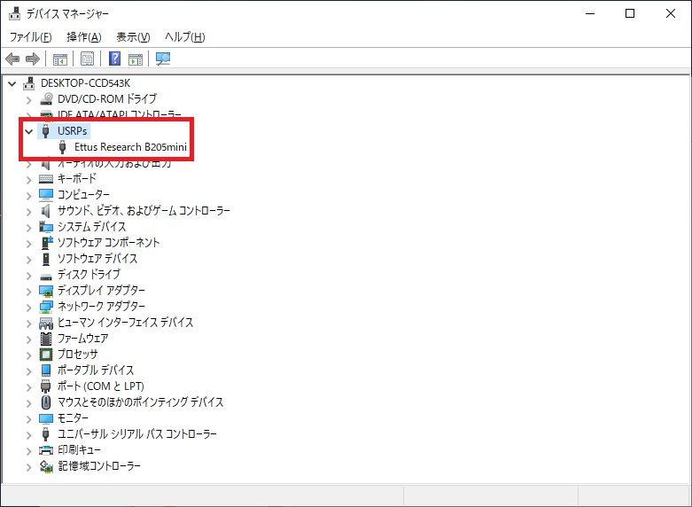 ドライバをインストールしてから再び「デバイス マネージャー」を開くと,図21のように“USRPs”という項目が表示され,“Ettus Research B205mini”が追加されていることが確認できます.