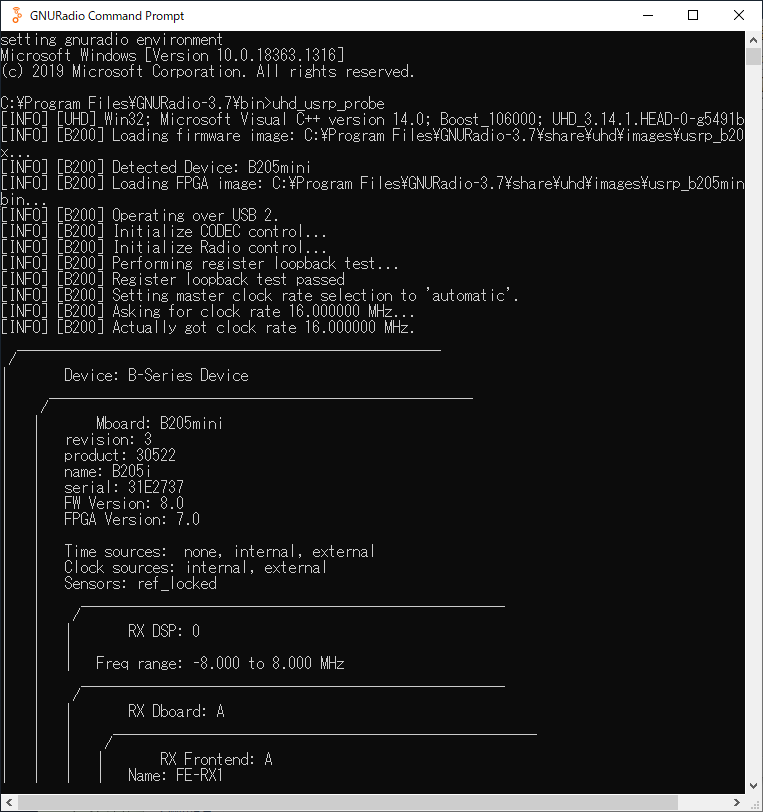 もし“Error: LookupError: KeyError: No devices found for —–$>$ Empty Device Address”などのエラー・メッセージが表示される場合は,ここまでのインストールの手順が正しく行われていることを確認してください.また,一度“USRP B205mini-i”をパソコンから抜いてから再び接続する,接続するUSBポートを変えてみる,パソコンを再起動するなどしてみてください.