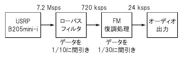 今回はローパス・フィルタでデータを1/10に間引きし,さらにその後のFM復調処理で1/30にデータを間引きします.すると,最終的なオーディオ出力のサンプリング・レートは“$7.2\ \mathrm{Msps} \div 300 = 24\ \mathrm{ksps}$”となります.FM放送の音声品質を考えると,妥当なサンプリング・レートであると言えます.