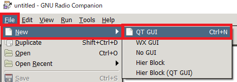 [Windowsスタート・メニュー] – [GNURadio 3.7] – [GNURadio Companion]をクリックして“GNU Radio Companion”を起動します.図24のように[File] – [New] – [QT GUI]をクリックして新しいファイルを用意します.