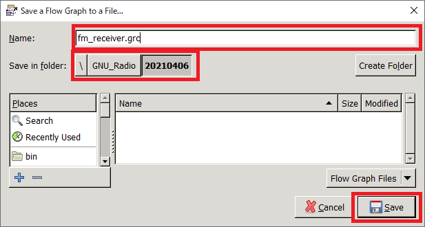 まだ何もしていませんが,先にファイルを保存しておきましょう.[File] – [Save as]をクリック(あるいは[Ctrl] + [s]を押す)して,図25のようなファイル保存のダイアログを出します.今回は“fm_receiver.grc”というファイル名にしました.繰り返しになりますが,保存先のパスには日本語が含まれないように注意してください.