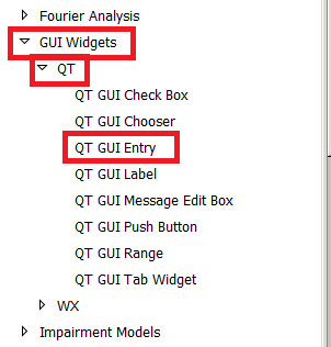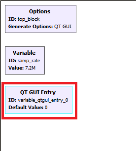 続いて,FMラジオの受信周波数を設定するための入力欄を用意します.GNU Radioの画面の右側にあるモジュール一覧で,“GUI Widgets”の欄を展開します.さらに“QT”の欄を展開すると“QT GUI Entry”というブロックがあります(図28).