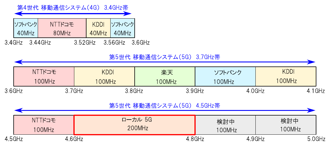 図3には,従来から使われている“4G”の「3.4 GHz帯」の周波数割り当ても記載しています.“4G”の帯域幅は基本的に“40 MHz”となっているのに対して,“5G”の「3.7 GHz帯」および「4.5 GHz帯」の帯域幅は“100 MHz”であり,従来の2倍程度の速度で通信できることがわかります(変調方式などの条件を一致させた場合).