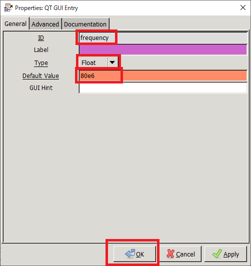 追加した“QT GUI Entry”ブロックをダブル・クリックすると,図30の画面が表示されます.ここで“ID”の欄に“frequency”と入力し,“Type”の欄を“Float”に設定,“Default Value”の欄に“80e6”と入力して[OK]をクリックします.