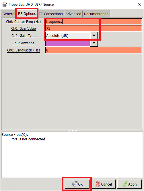 続いて,図34のように“RF Options”のタブを選択します.“Ch0: Center Freq (Hz)”の欄に“frequency”と入力します.これで,さきほど用意した“GUI QT Entry”の“frequency”の値がUSRPで受信するキャリア周波数として設定されます.また,“Ch0: Gain Value”の欄には“75”と入力し,“Ch0: Gain Type”の欄では“Absolute (dB)”を選択します.これで,“USRP B205mini-i”のRFアンプのゲインが最大値の75 dBに設定されます(これはRF ICのAD9364の仕様にもとづく).