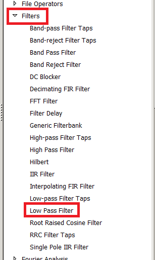 次は,不要な信号の除去とデータの間引きに使うローパス・フィルタ(Low Pass Filter)を追加します.図35のように,“Filters”の欄から“Low Pass Filter”を探します.このブロックを先ほど設置した“UHD: USRP Source”ブロックの隣に置きます(図36).