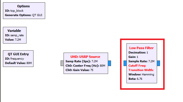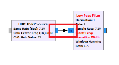 ここで,“UHD: USRP Source”ブロックの右側の青い端子をクリックした状態で,“Low Pass Filter”ブロックの左側の青い端子をクリックします.すると,図37のように2つのブロックが接続されます.今後は同様にしてブロック間の配線を行うものとします.