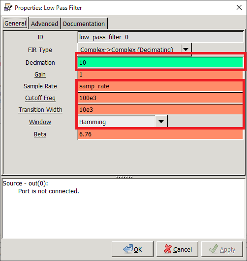 設置した“Low Pass Filter”ブロックをダブル・クリックして,図38の設定画面を出します.“Decimation”の欄に“10”,“Smple Rate”の欄に“samp_rate”,“Cutoff Freq”の欄に“100e3”,“Transition Width”の欄に“10e3”と入力し,“Window”の欄で“Hamming”を選択して[OK]をクリックします.