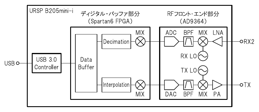 図4に“USRP B205mini-i”の内部ブロック図を示します.大きく分けると「RFフロント・エンド部分」,「ディジタル・バッファ部分」,「USBコントローラ部分」の3つのブロックで構成されています.