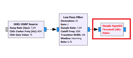 FM放送における「ザー」というノイズを低減するために,「スケルチ」(squelch)の処理を追加しておきます(スケルチは必須ではない).図39のように“Level Controllers”の欄から“Simple Squelch”を探して,図40のように“Low Pass Filter”ブロックの隣に置きます.