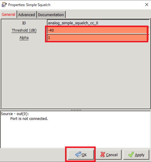 追加した“Simple Squelch”ブロックをダブル・クリックして,図41の画面を出します.“Threshold (dB)”の欄に“-40”,“Alpha”の欄に“1”と入力して[OK]をクリックします.なお,“Threshold”の値はお好みに応じて変更してください.