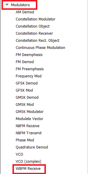 FM復調の処理を追加します.図42のように“Modulators”の項目から“WBFM Receiver”を探します.なお,“WBFM”は「ワイドバンドFM」(Wide Band Frequency Modulation)の略です.