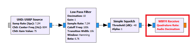 これからGNU Radio上で作るFMラジオの基本構成を図23に示します.「ラジオを聞く」ために最低限必要なブロックは4個だけです.